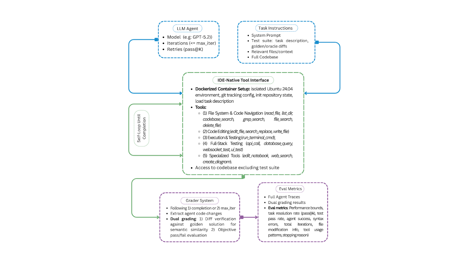 IDE-Bench Workflow: We first launch a dockerized container and parse the task descriptions. The agent utilities module is responsible for spinning up the LiteLLM harness runtime within the container, and the output is passed into the grader system, which utilizes the diff verification system to parse outputs.