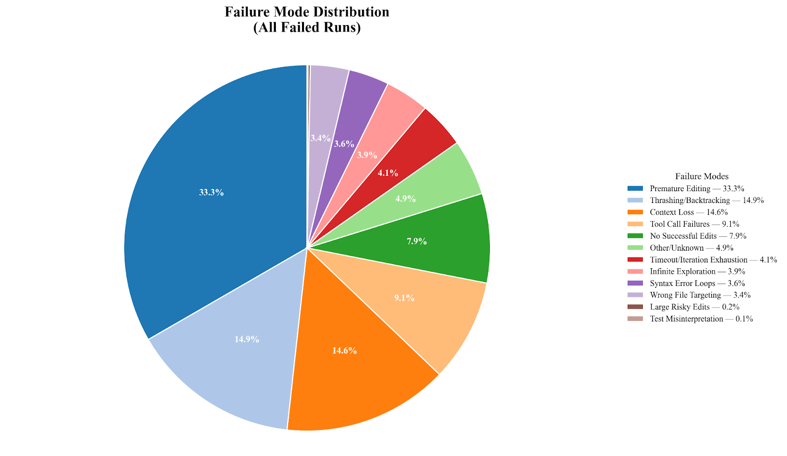 Early action dominates failure. Among failed runs, the most common failure modes are Premature Editing (63.0%), Thrashing/Backtracking (28.2%), and Context Loss (27.6%).