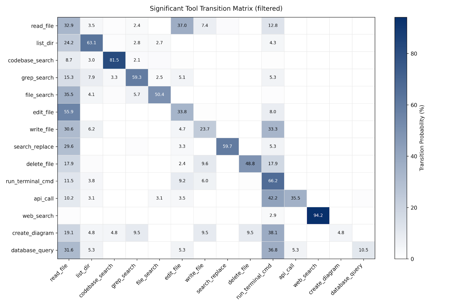 Tool usage is self-chaining. Search and execution tools self-chain at high rates, reflecting refinement loops: codebase_search→codebase_search 81.5%, run_terminal_cmd→run_terminal_cmd 66.2%, list_dir→list_dir 63.1%, grep_search→grep_search 59.3%.